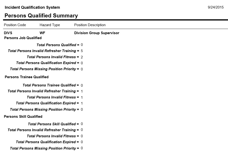 This report lists the total number of persons with a current JOB qualification for any position in the database. The filter State-NWCG/Organization is required for this report. The Job Code/Hazard Type and Employment Status filters are optional. Use the Job Code/Hazard Type filter to produce the report for 1 job code only. Report records are sorted alphabetically by job code.