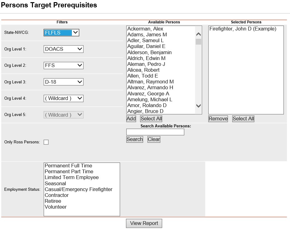 This report lists the target positions for an individual and the requirements for that position. The information is similar to that displayed on the Certifications/Target Position screen. The filter State-NWCG/Organization is required for this report. The Person filter is required. The ROSS Persons and Employment Status filters are optional. The report records are sorted alphabetically by last name within the specified organization level.