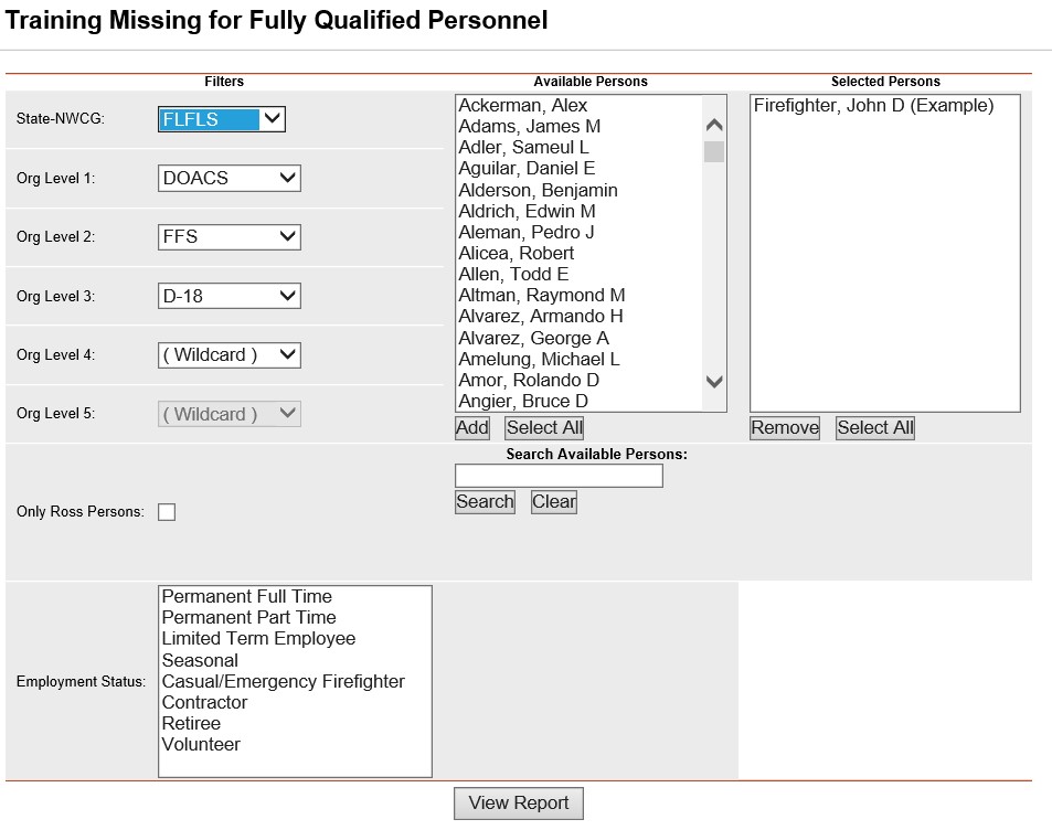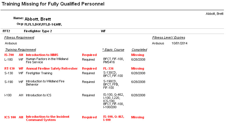 This report lists the training required for each position to which a person is fully qualified. One or more persons can be selected. For each of the persons qualifications, the required training is listed with missing training highlighted in Red and the word "Missing" in the completed column.